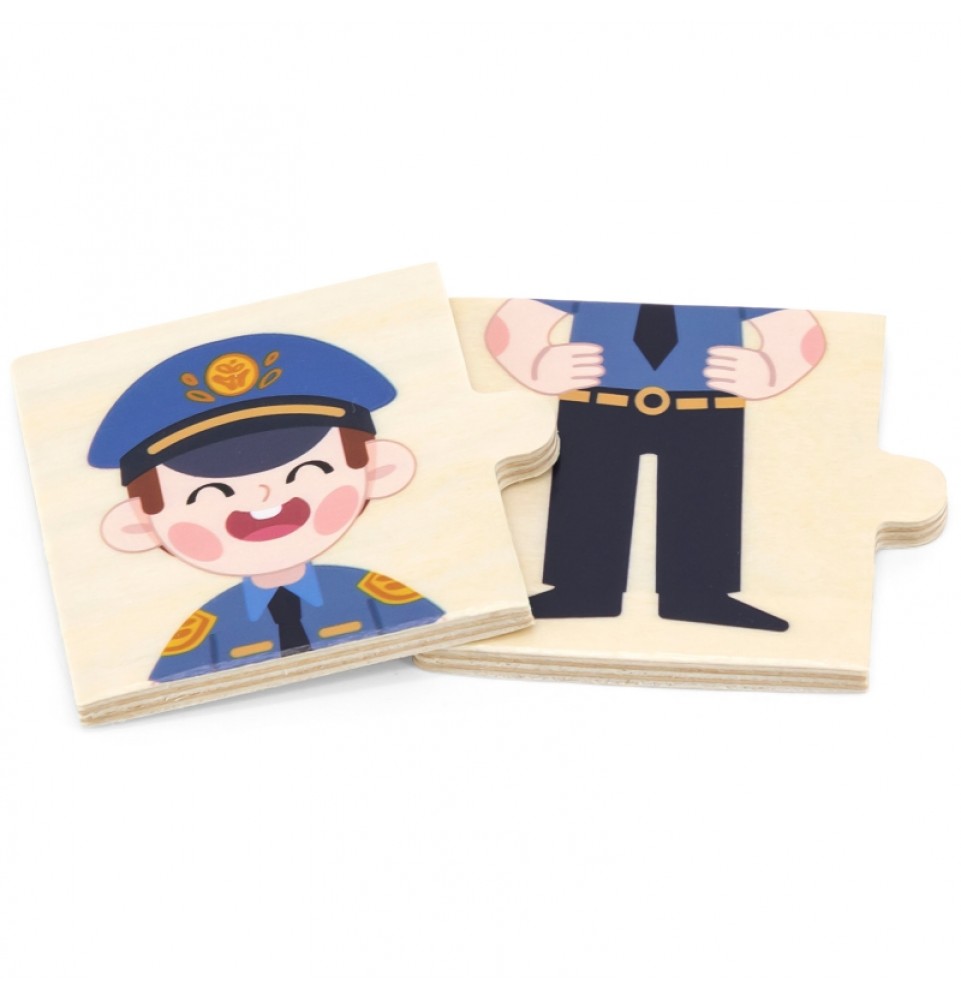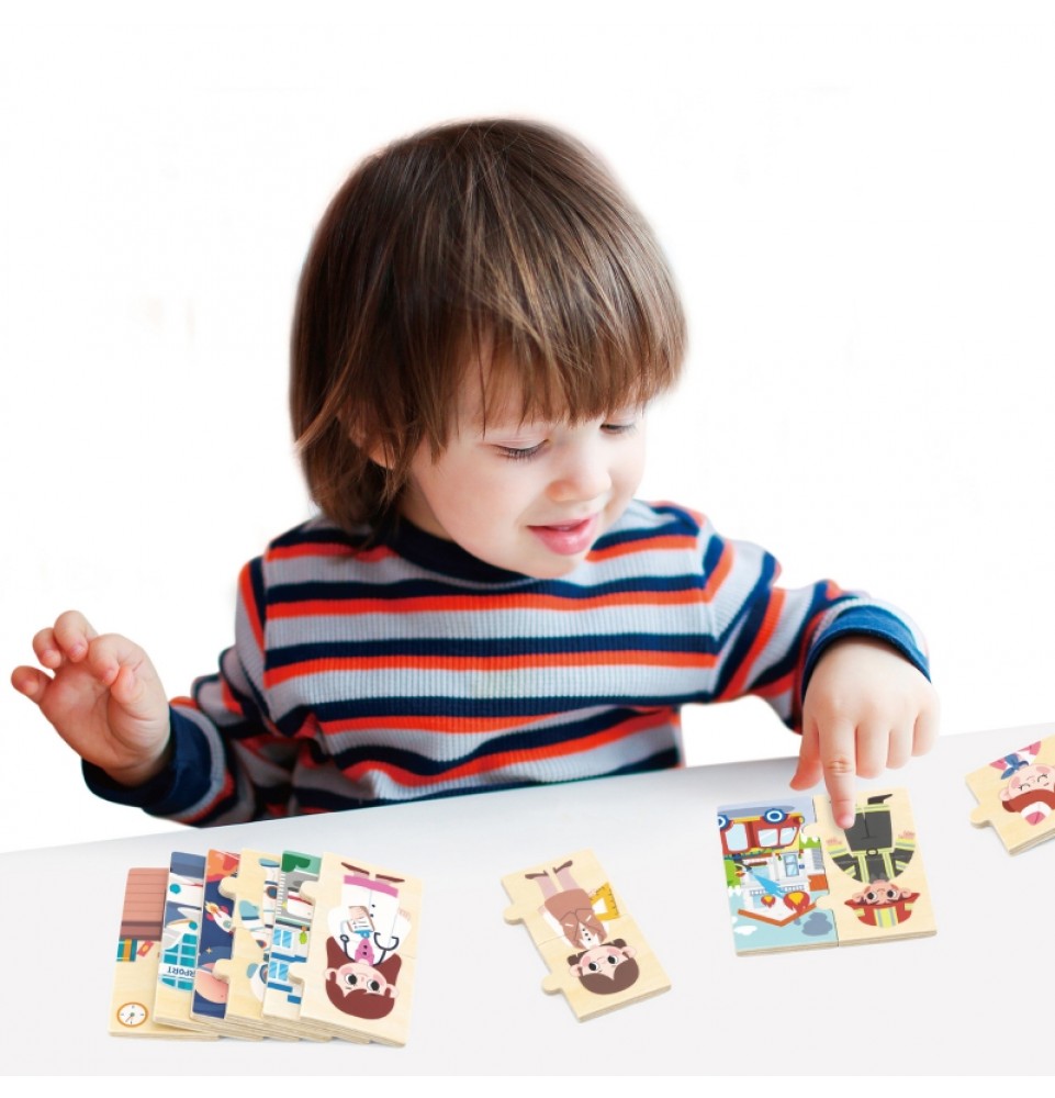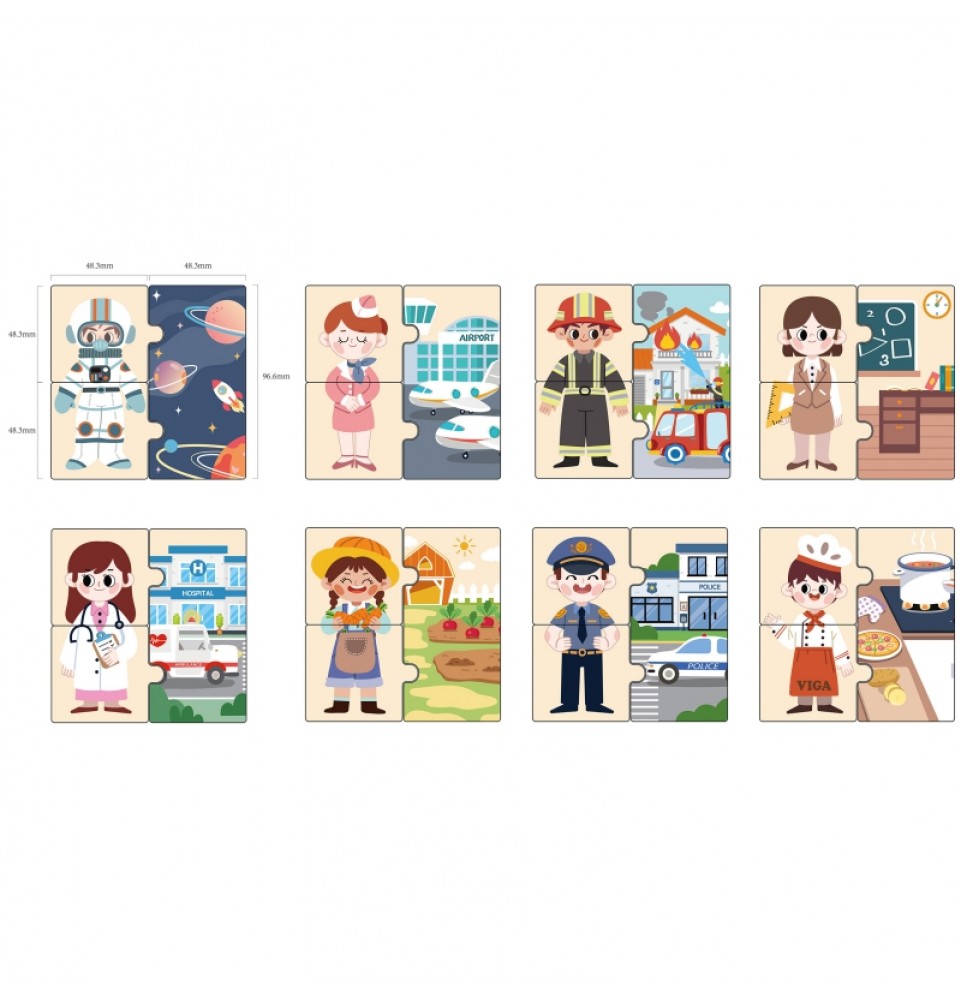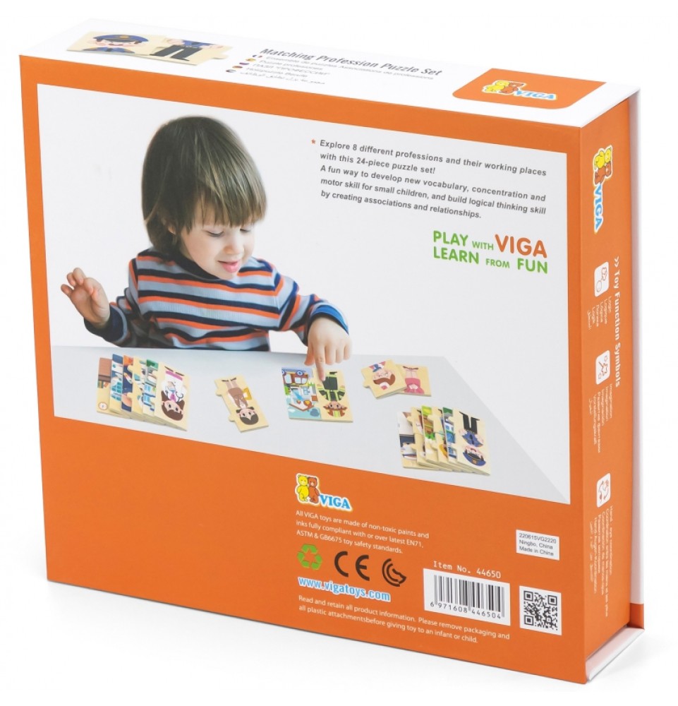 Medinis VIGA dėlionės rinkinys, sudarytas iš 24 spalvingų dėlionės detalių, padės atrasti 8 profesijas ir jų darbo vietas . Žaidimo metu maži vaikai lavins savo žodyną, susikaupimą, motorinius įgūdžius ir loginį mąstymą, derindami ir atrasdami ryšius. Priskirkite tinkamą profesiją jos darbo vietai.