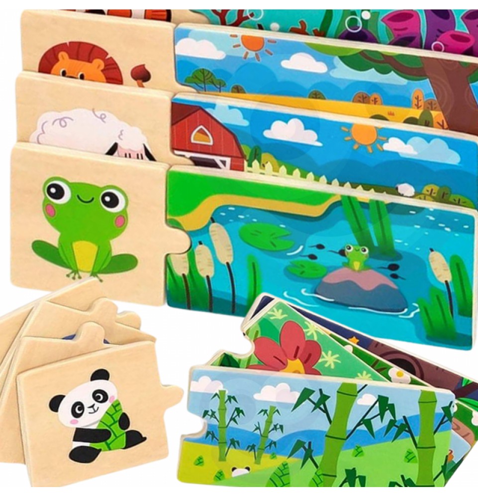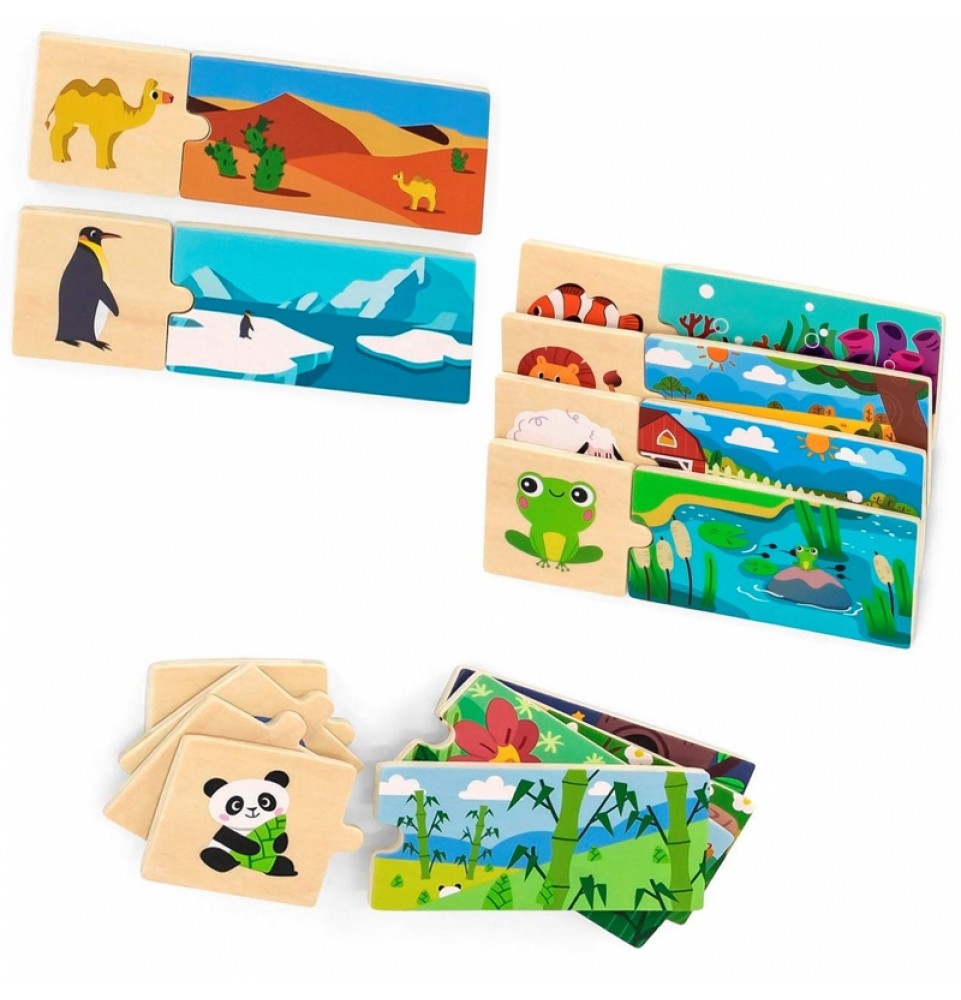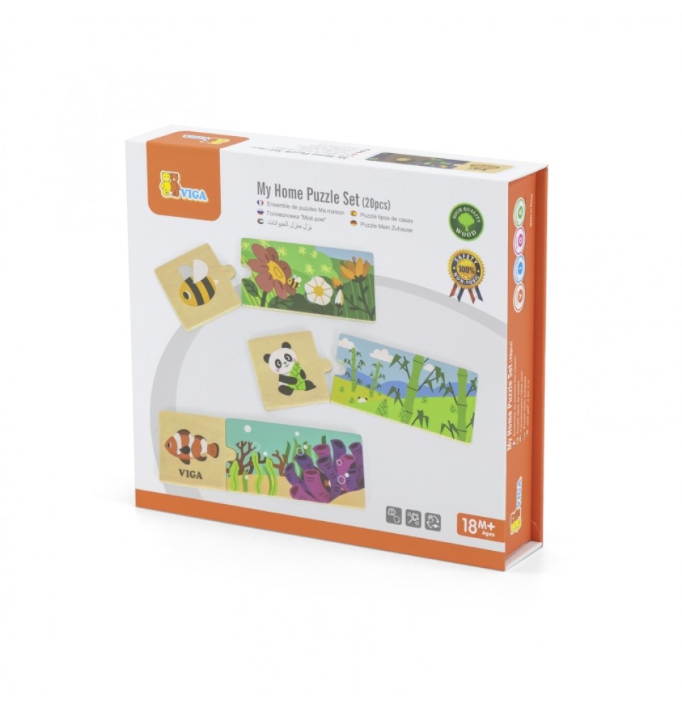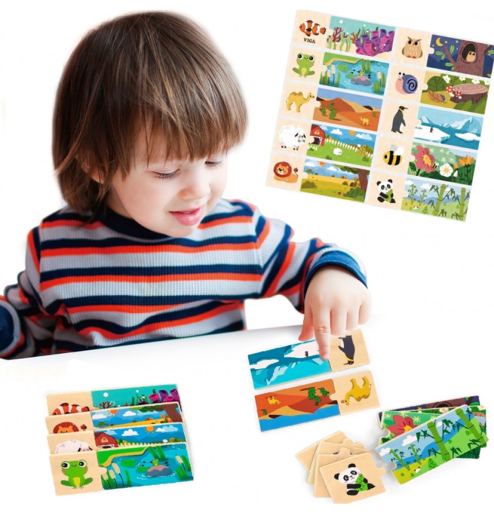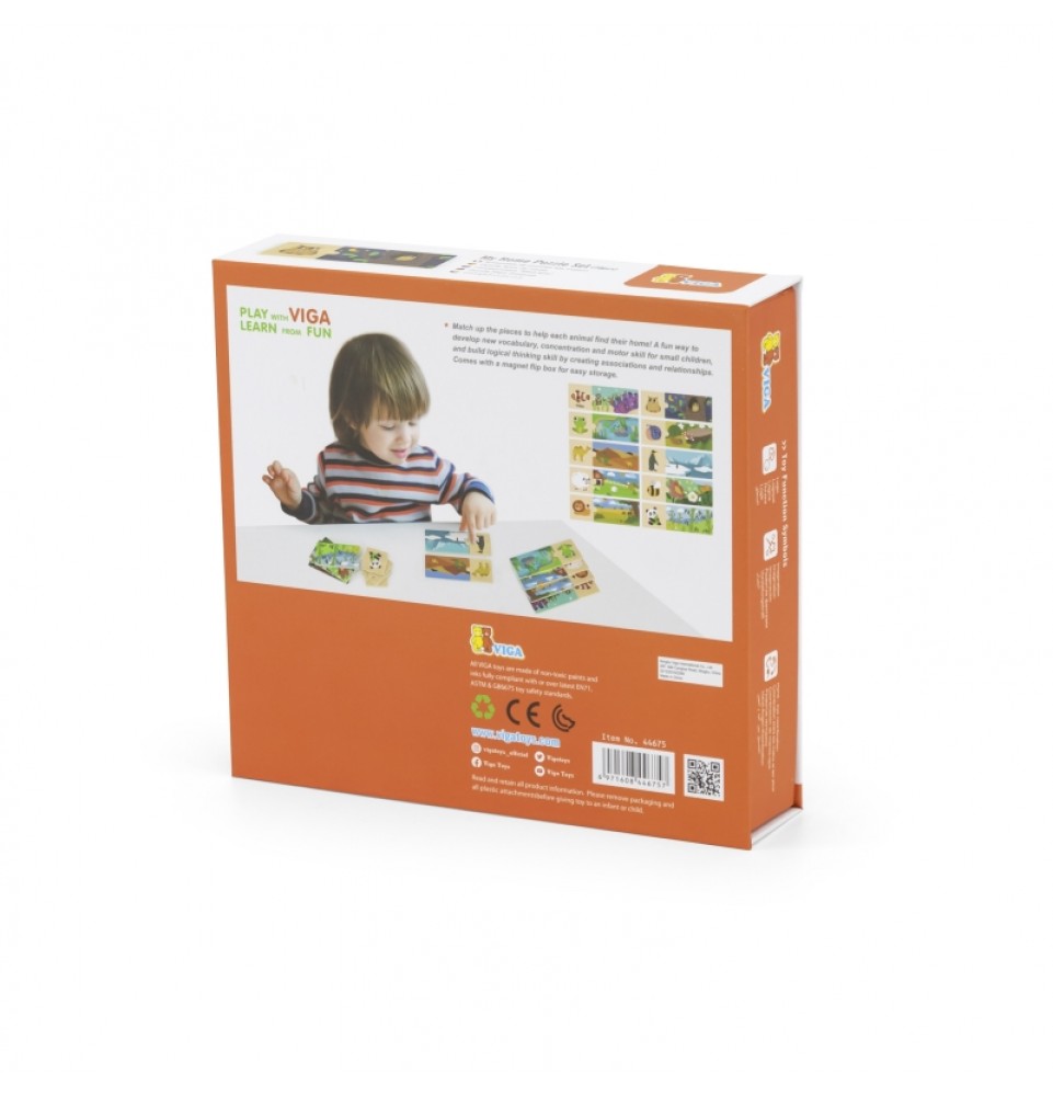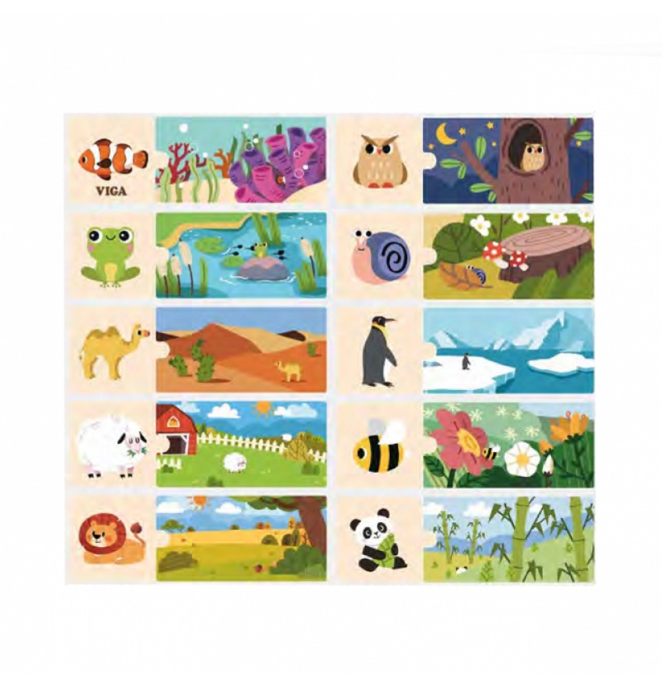 VIGA prekės ženklo loginiai galvosūkiai – smagu surinkti vienodas detales . Rinkinį sudaro 20 detalių , kurias reikia sujungti taip, kad gyvūnas būtų priskirtas savo natūraliai buveinei. Detalės yra labai gerai suderintos ir pasižymi spalvingais paveikslėliais .
