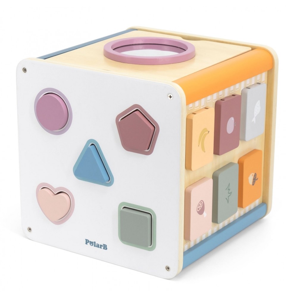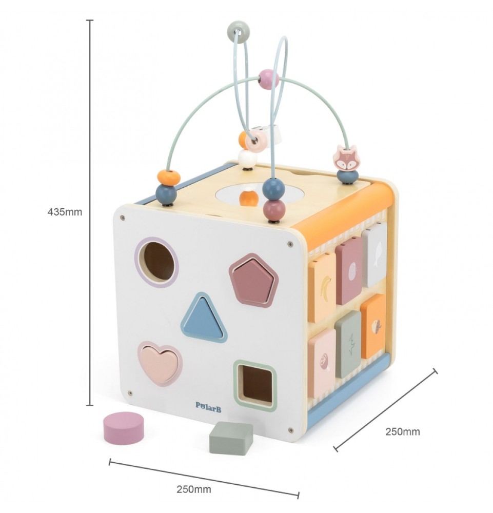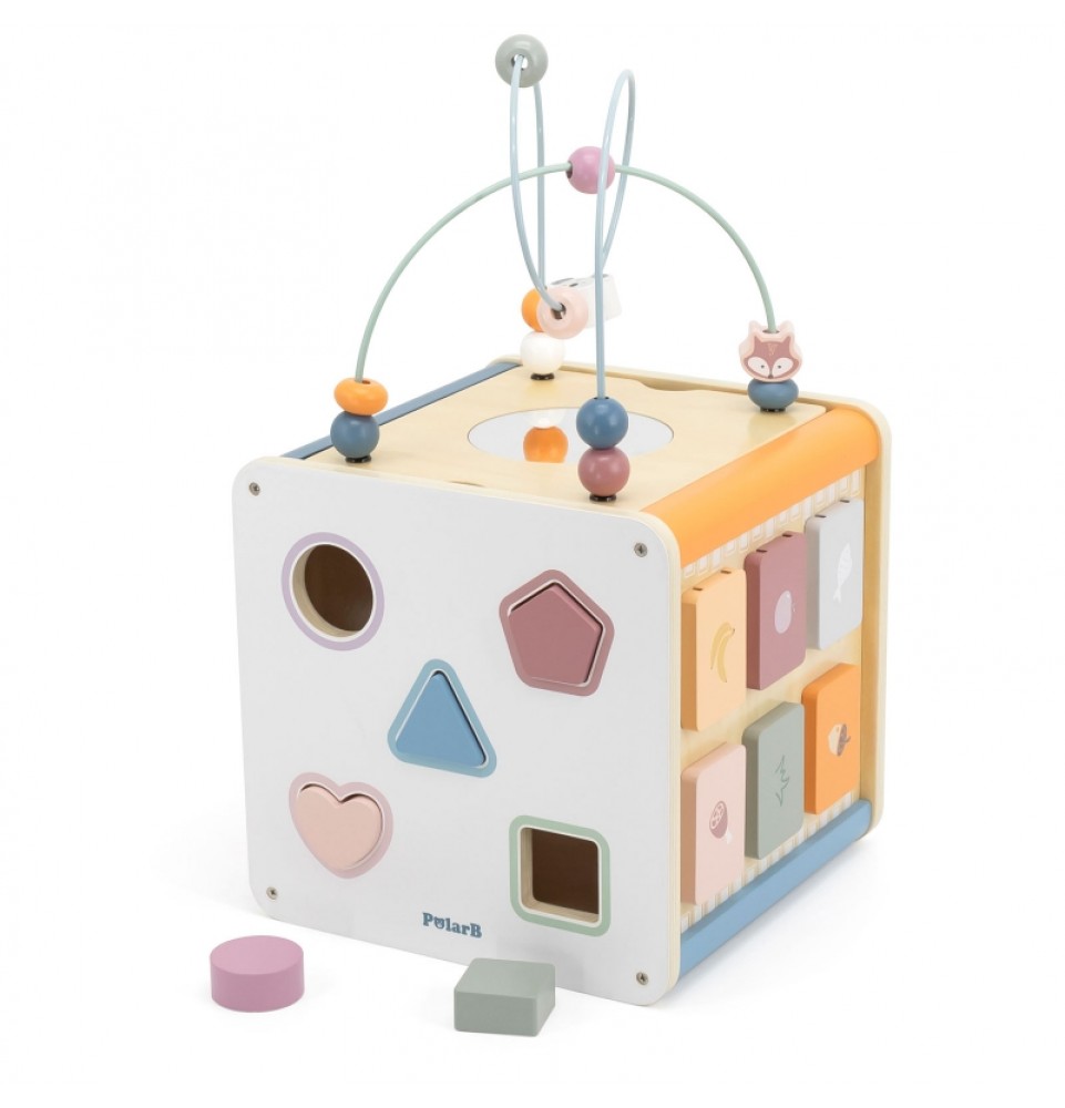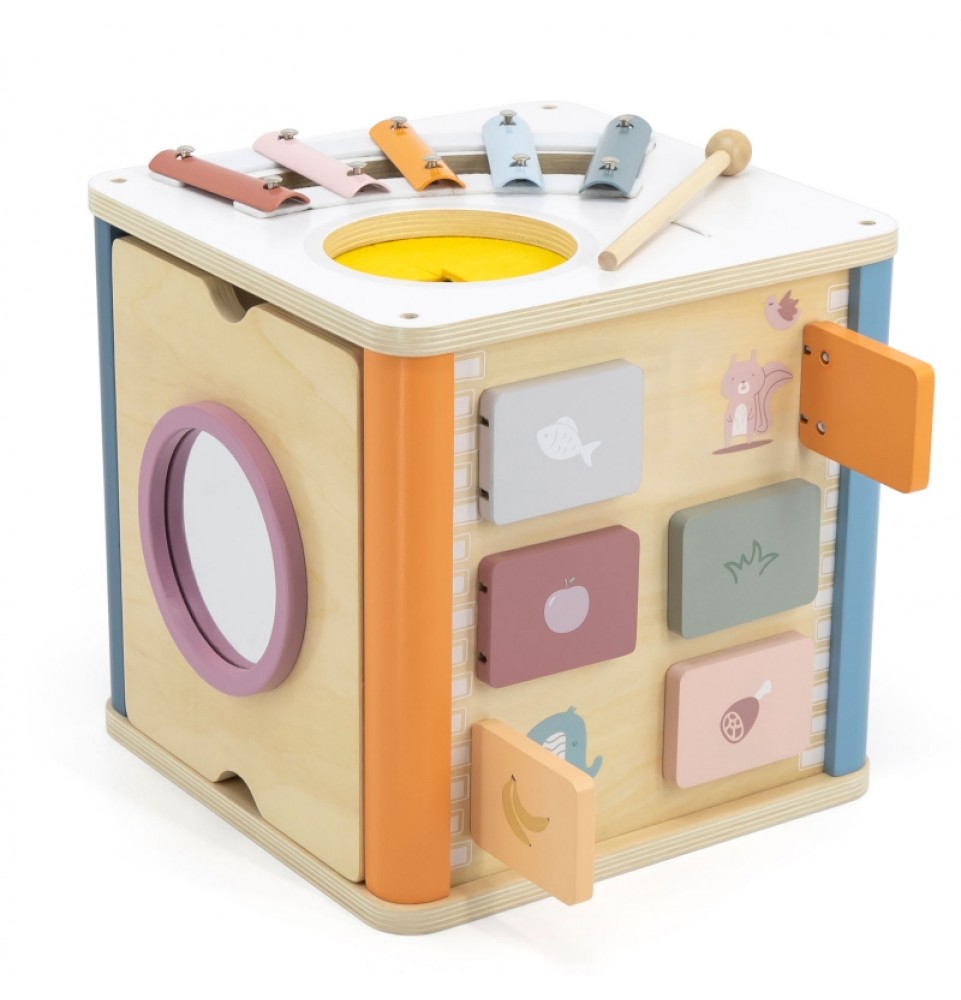 Šis edukacinis kubas turi aštuonias skirtingas veiklas , skirtas spręsti skirtingus vaiko raidos aspektus ir skatinti mokymąsi. Formų rūšiavimo įrankis, motorinė kilpa ir verpimo ratelis lavina akių ir rankų koordinaciją, smulkiąją motoriką ir erdvinį suvokimą. Ksilofonas ir kreidinė lenta skatina kūrybiškumą, o veidrodis ir kaladėles šalinantis ekranas padeda kognityviniam vystymuisi. Aštuntoji ir paskutinė veikla – siena su paslėptais gyvūnais už atvartų, atitinkančių jų maistą.
