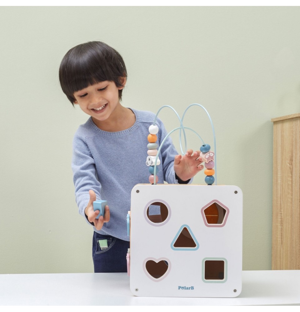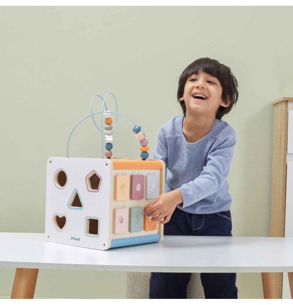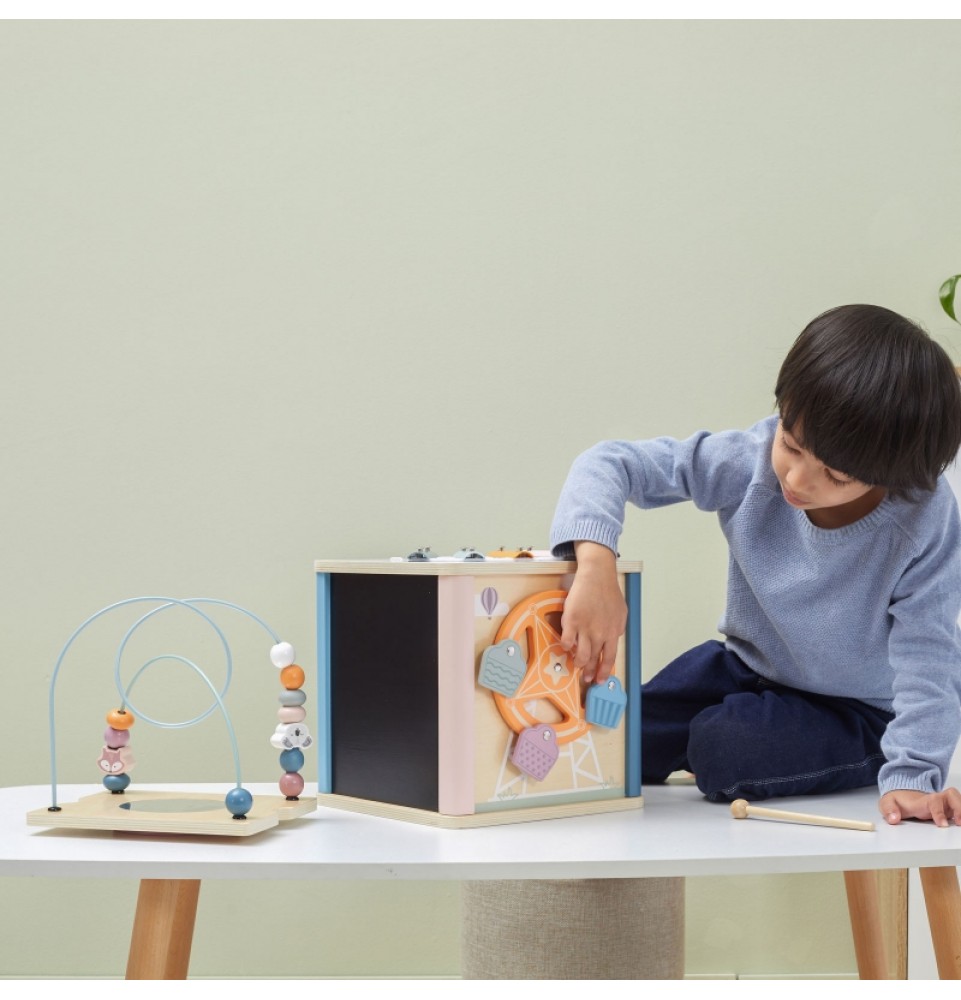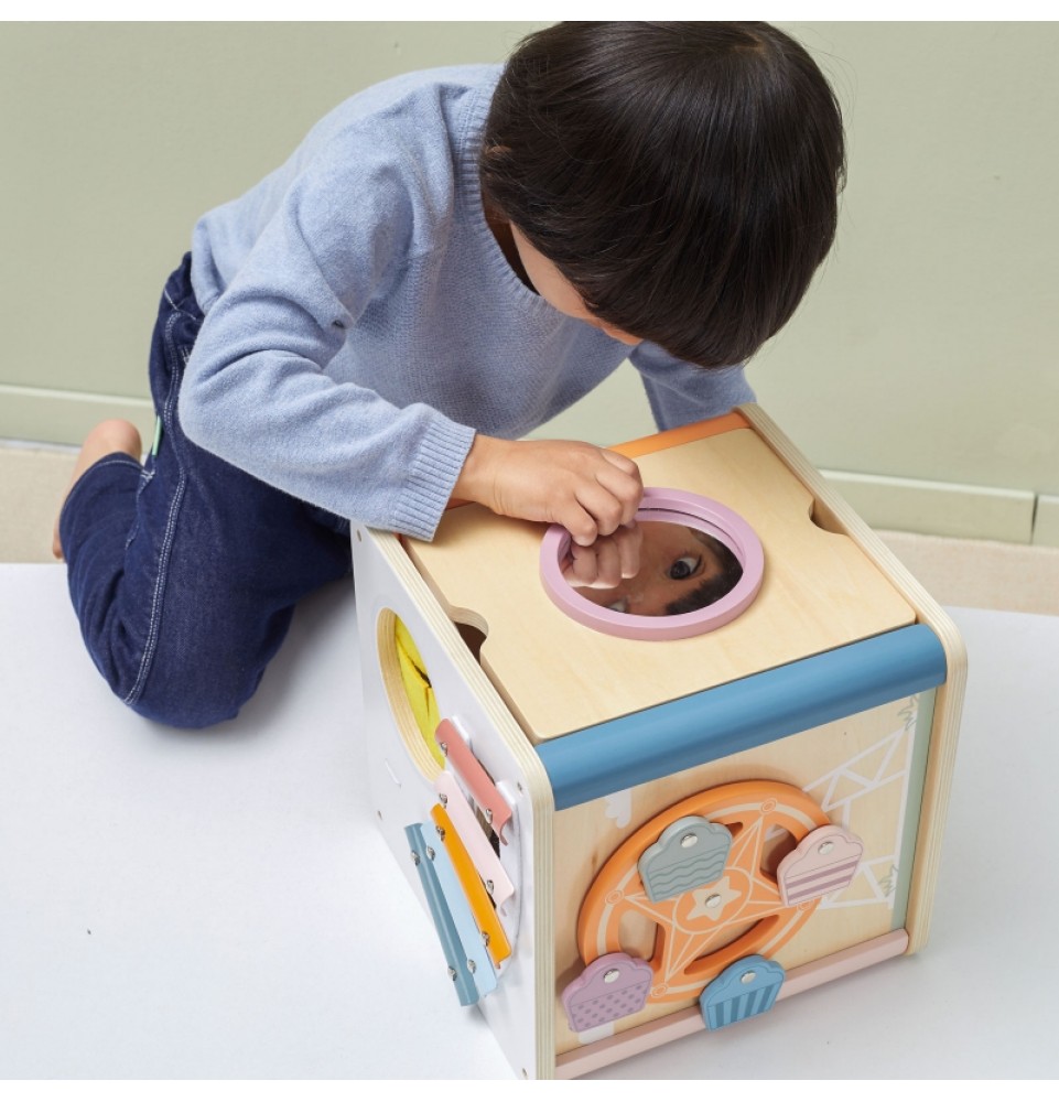 Šis edukacinis kubas turi aštuonias skirtingas veiklas , skirtas spręsti skirtingus vaiko raidos aspektus ir skatinti mokymąsi. Formų rūšiavimo įrankis, motorinė kilpa ir verpimo ratelis lavina akių ir rankų koordinaciją, smulkiąją motoriką ir erdvinį suvokimą. Ksilofonas ir kreidinė lenta skatina kūrybiškumą, o veidrodis ir kaladėles šalinantis ekranas padeda kognityviniam vystymuisi. Aštuntoji ir paskutinė veikla – siena su paslėptais gyvūnais už atvartų, atitinkančių jų maistą.
