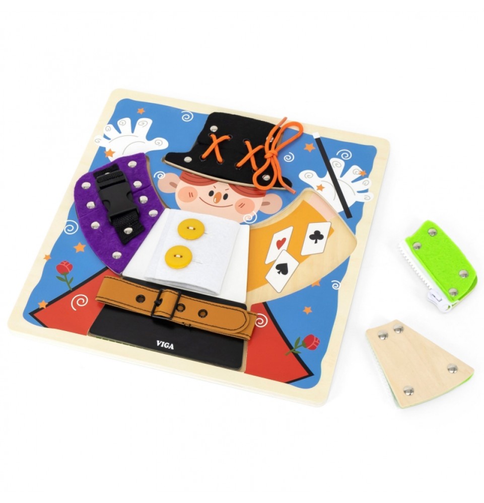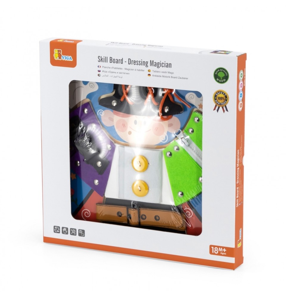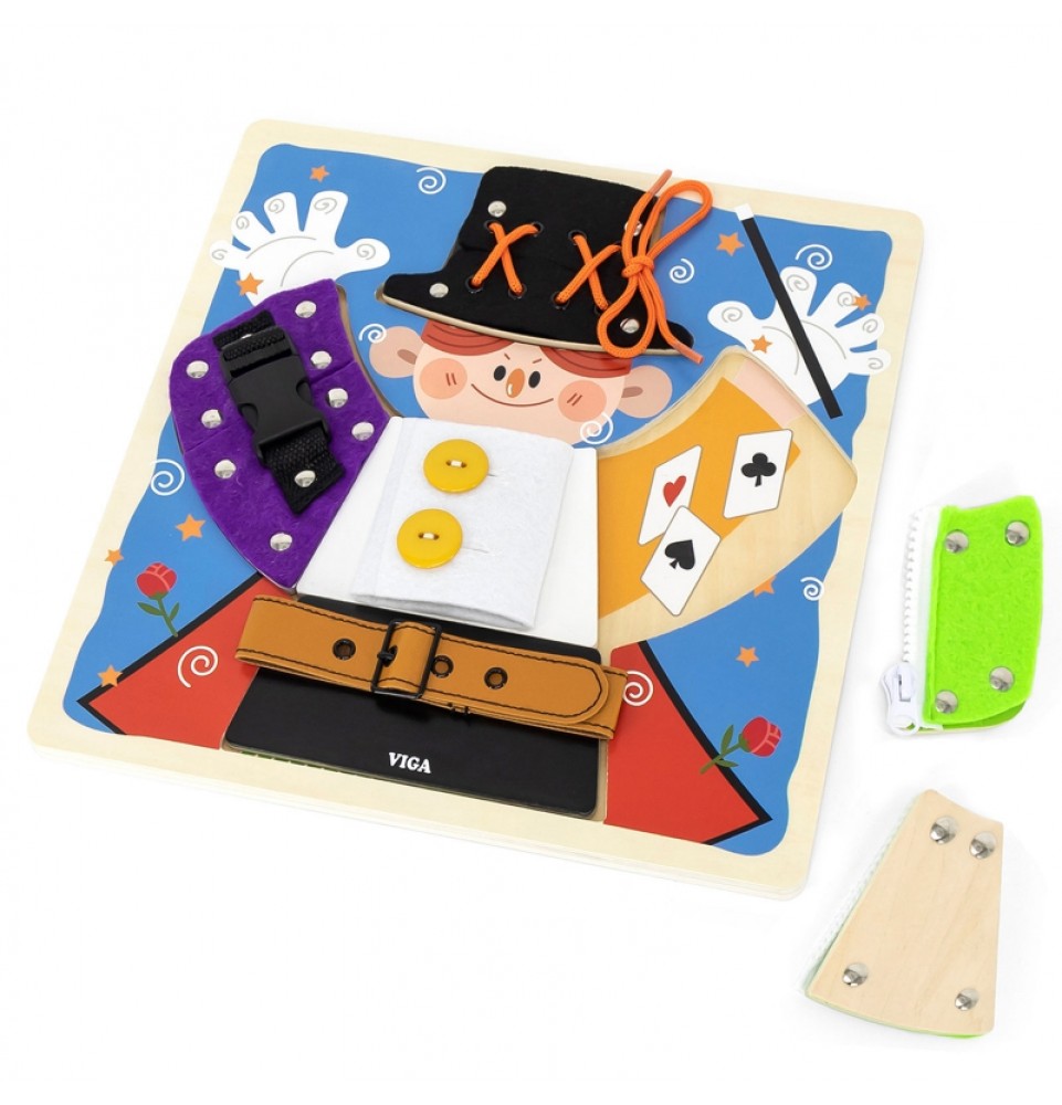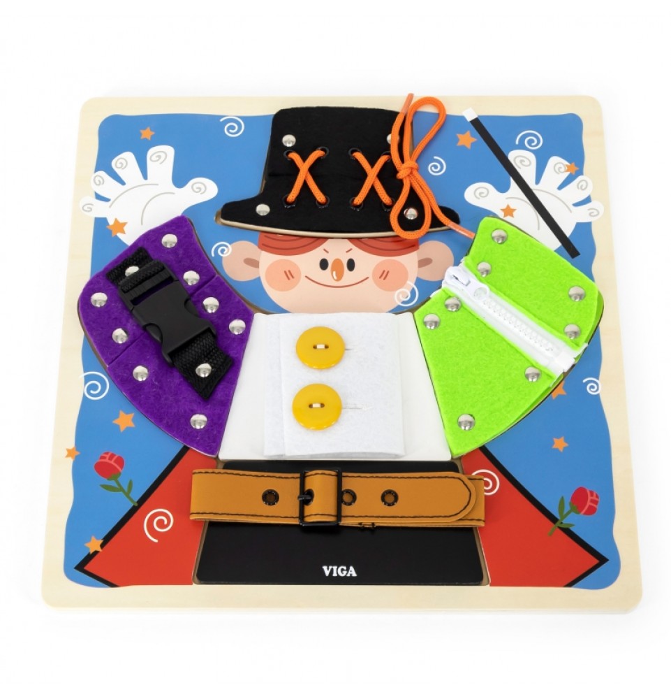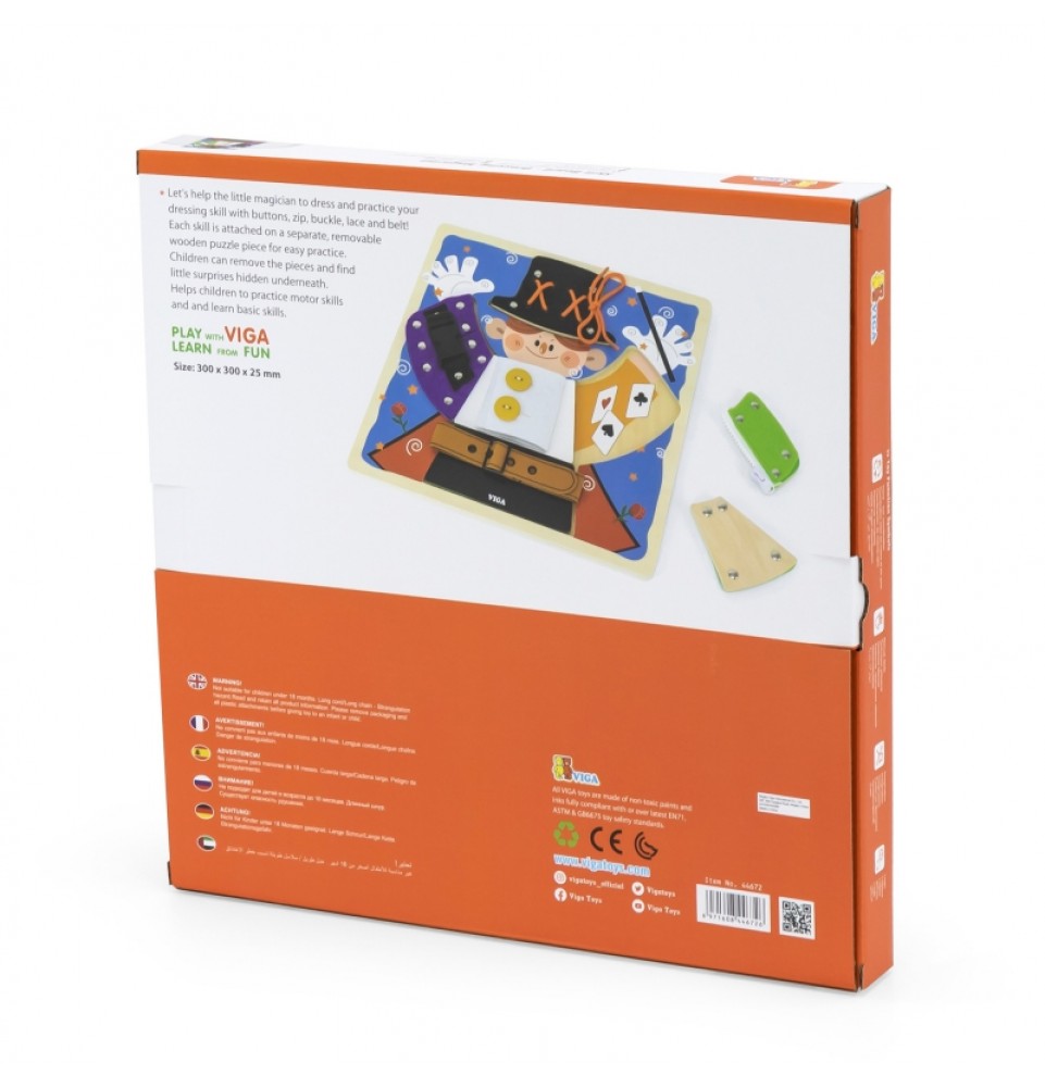 VIGA mago manipuliacinė lenta padės lavinti savarankiško rengimosi įgūdžius. Žaisdami persirengimo žaidimus, vaikai išmoks apsirengimo pagrindų, tokių kaip raištelių varstymas, užtrauktukų, sagų, spaudžių ir sagčių užsegimas . Kiekvienai iš šių veiklų manipuliacinėje lentoje yra atskira mažojo mago drabužių dalis, kurią galima praktikuoti atskirai. Po šiomis dalimis paslėpti mago triukų elementai: zuikutis, korta, balandis ir gėlių puokštė, todėl lentas galima naudoti ir atminties žaidimui.