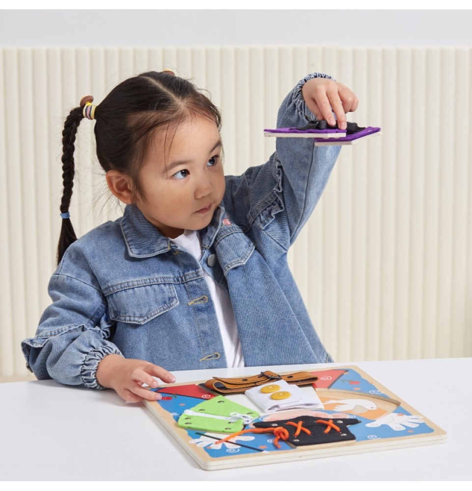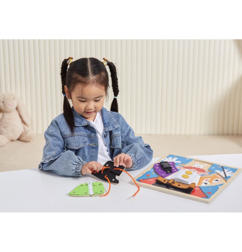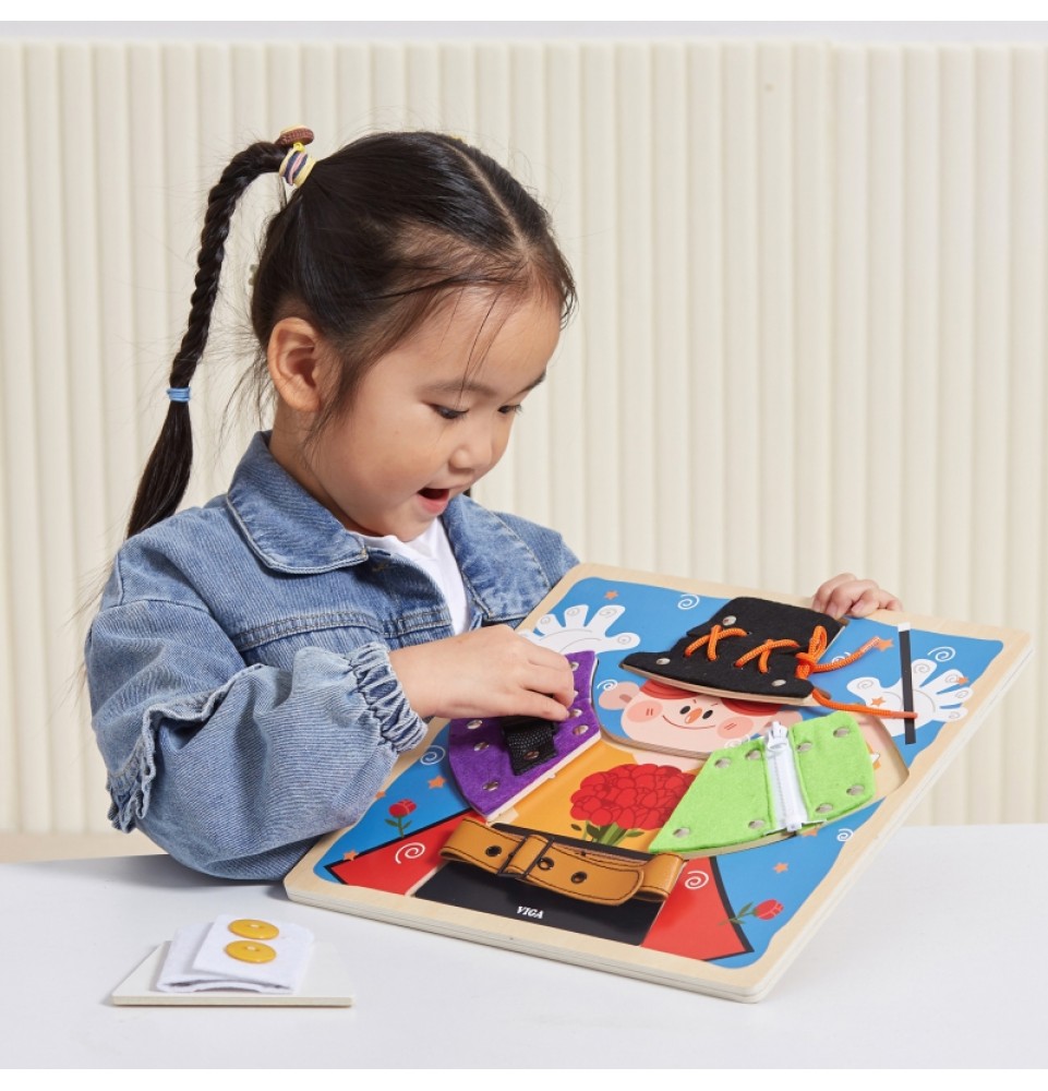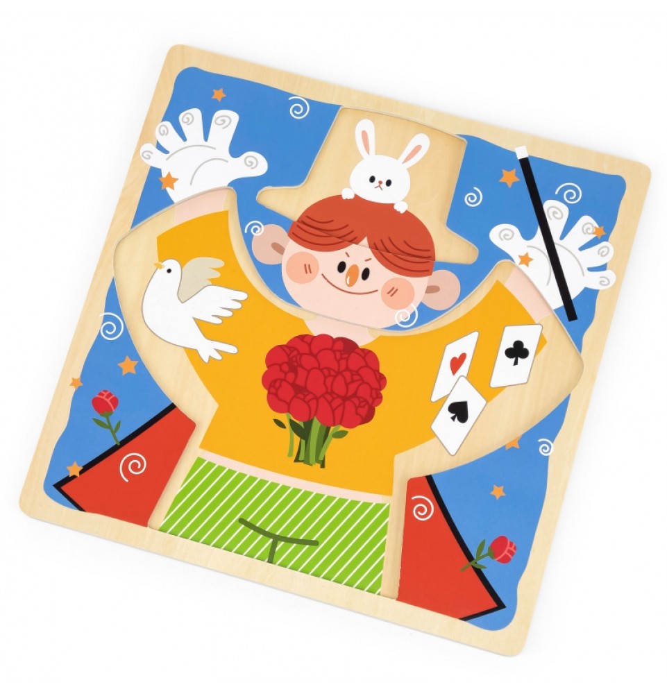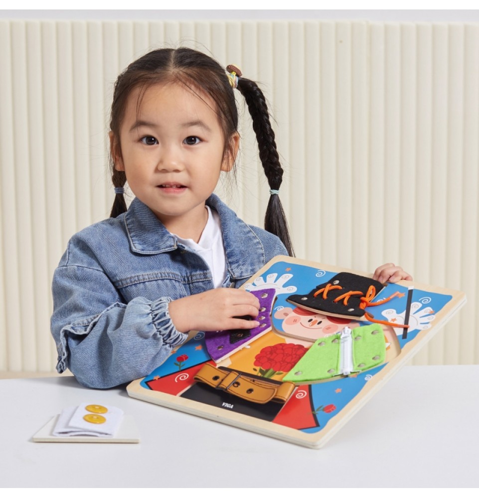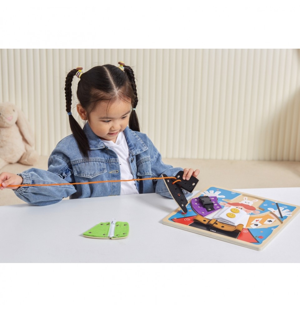 VIGA mago manipuliacinė lenta padės lavinti savarankiško rengimosi įgūdžius. Žaisdami persirengimo žaidimus, vaikai išmoks apsirengimo pagrindų, tokių kaip raištelių varstymas, užtrauktukų, sagų, spaudžių ir sagčių užsegimas . Kiekvienai iš šių veiklų manipuliacinėje lentoje yra atskira mažojo mago drabužių dalis, kurią galima praktikuoti atskirai. Po šiomis dalimis paslėpti mago triukų elementai: zuikutis, korta, balandis ir gėlių puokštė, todėl lentas galima naudoti ir atminties žaidimui.