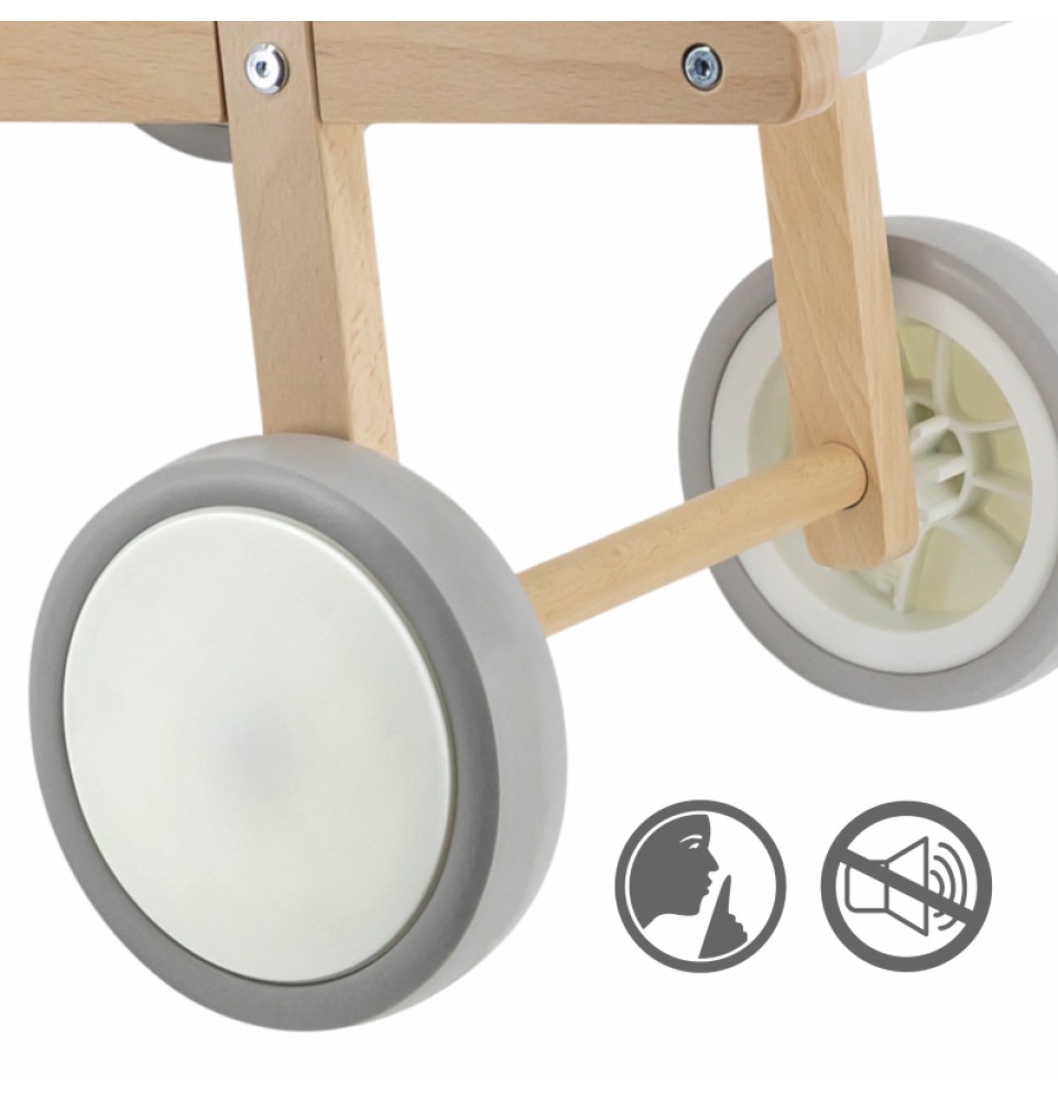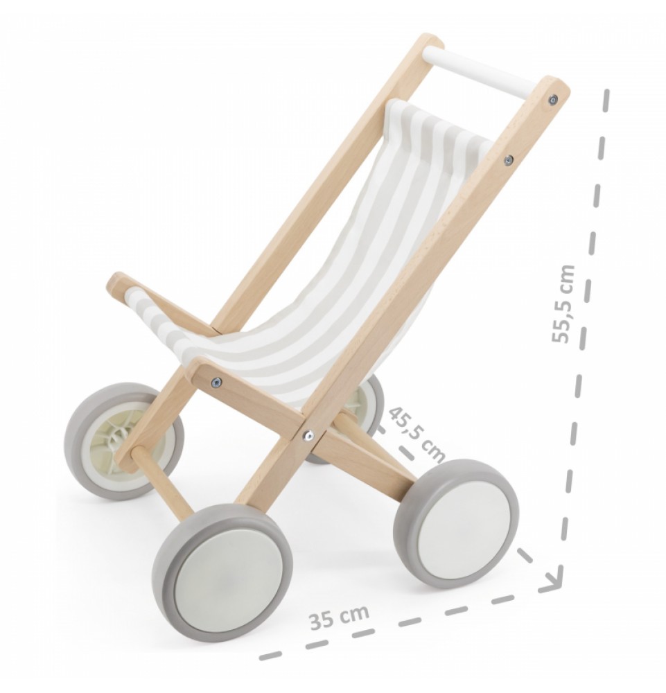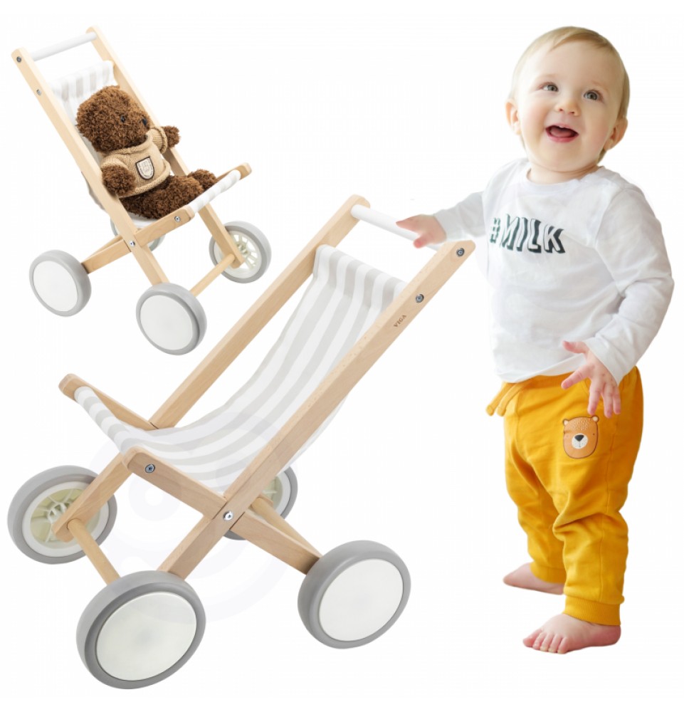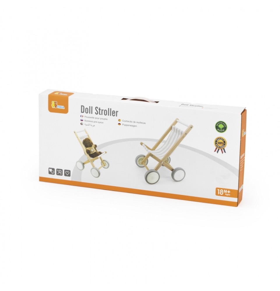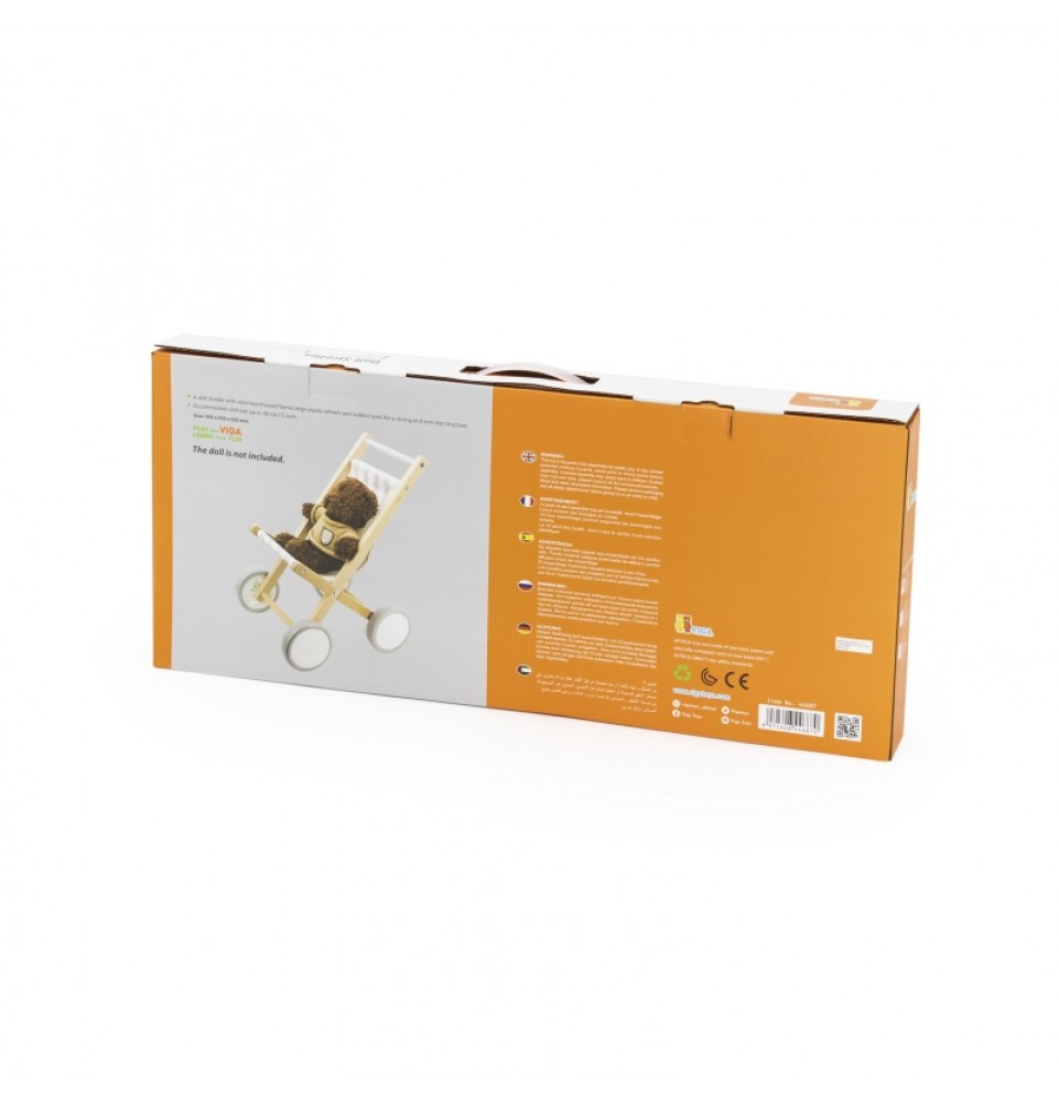 Šis VIGA lėlių vežimėlis pagamintas iš tvirtos buko medienos, su dideliais plastikiniais ratais ir neslystančiomis guminėmis padangomis . Jis skirtas iki 38 cm dydžio lėlėms.