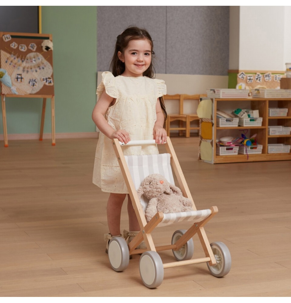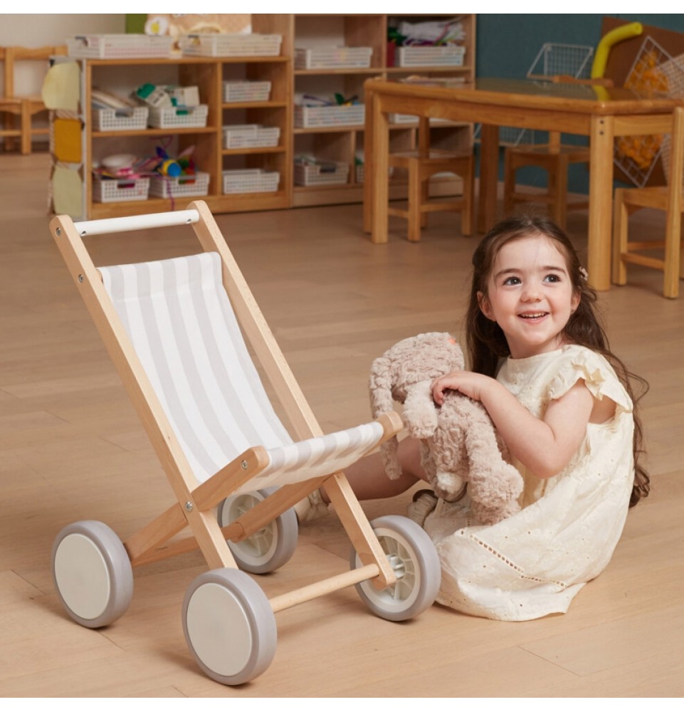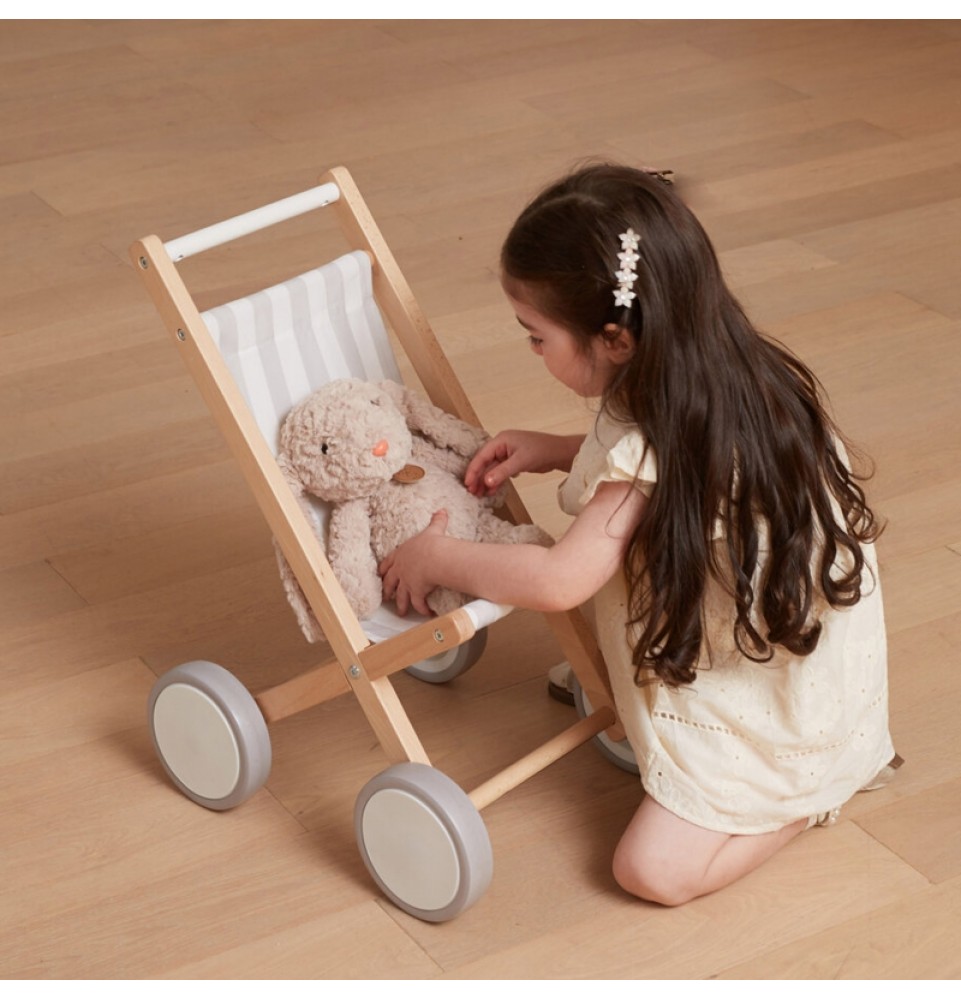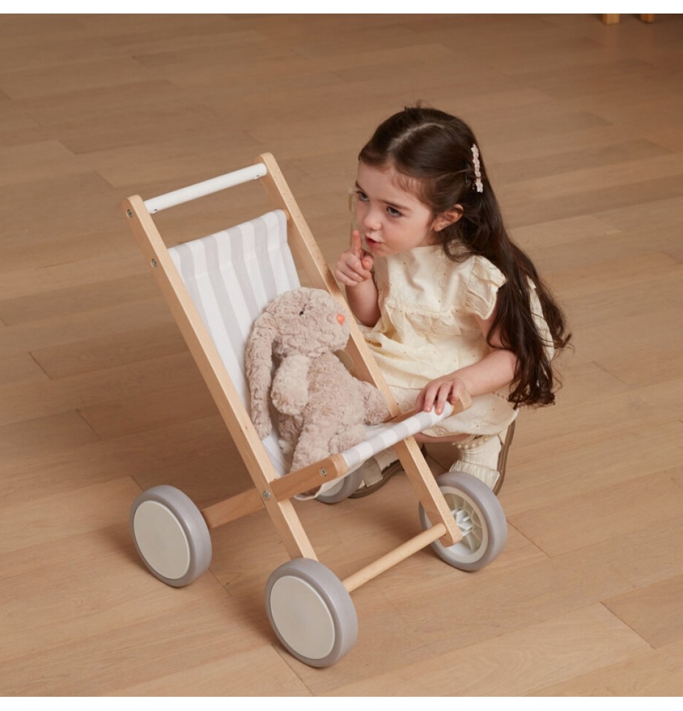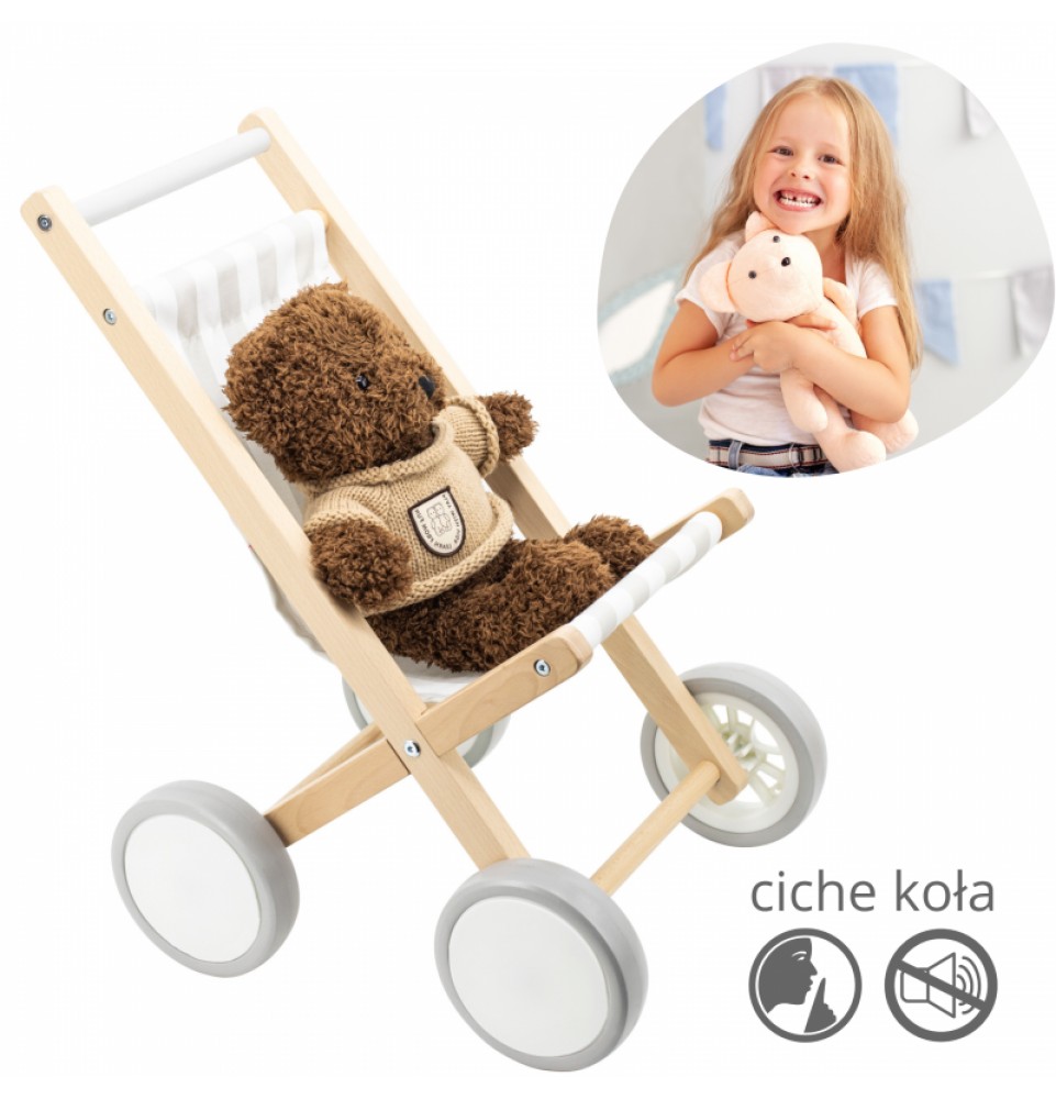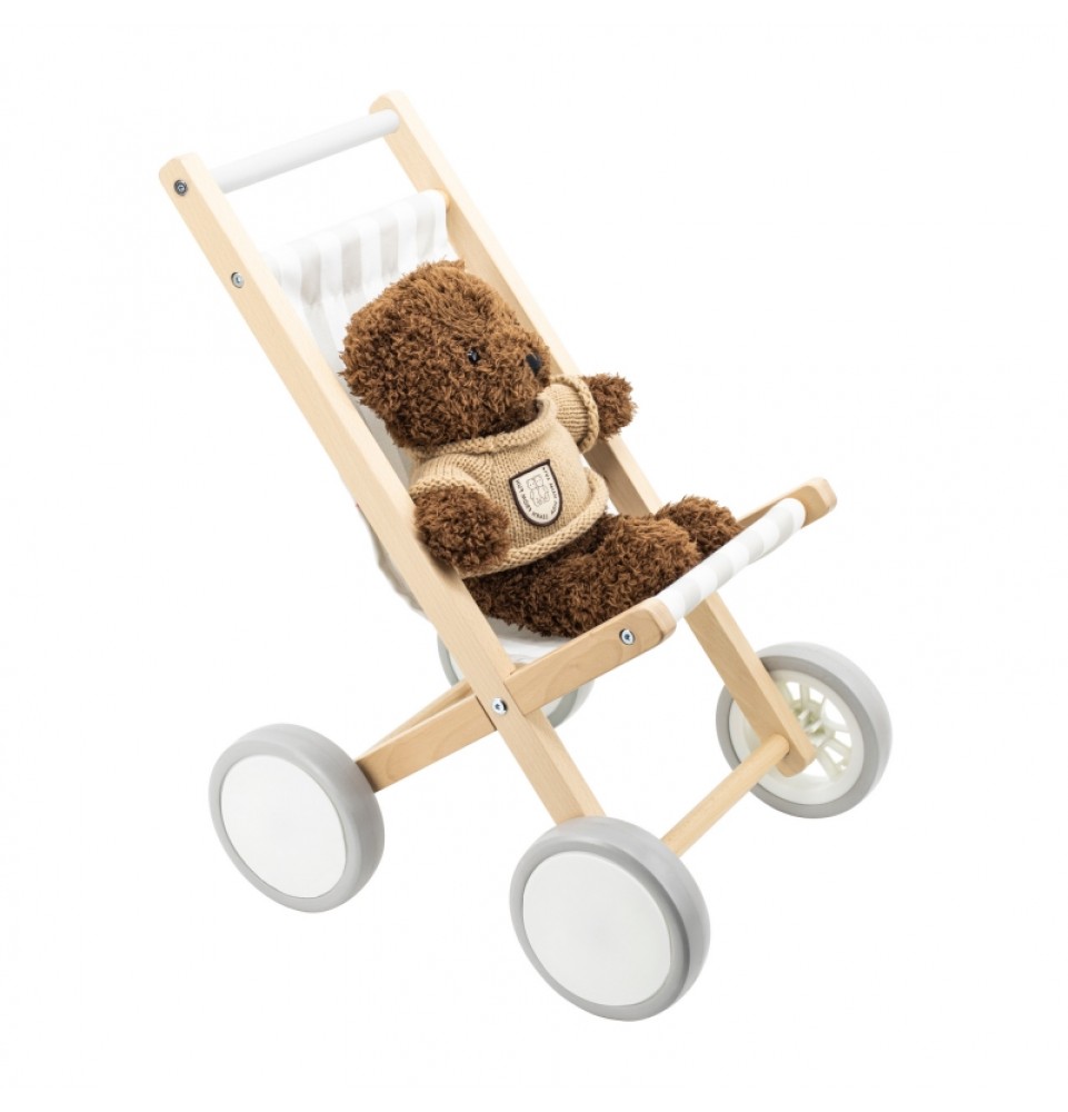 Šis VIGA lėlių vežimėlis pagamintas iš tvirtos buko medienos, su dideliais plastikiniais ratais ir neslystančiomis guminėmis padangomis . Jis skirtas iki 38 cm dydžio lėlėms.