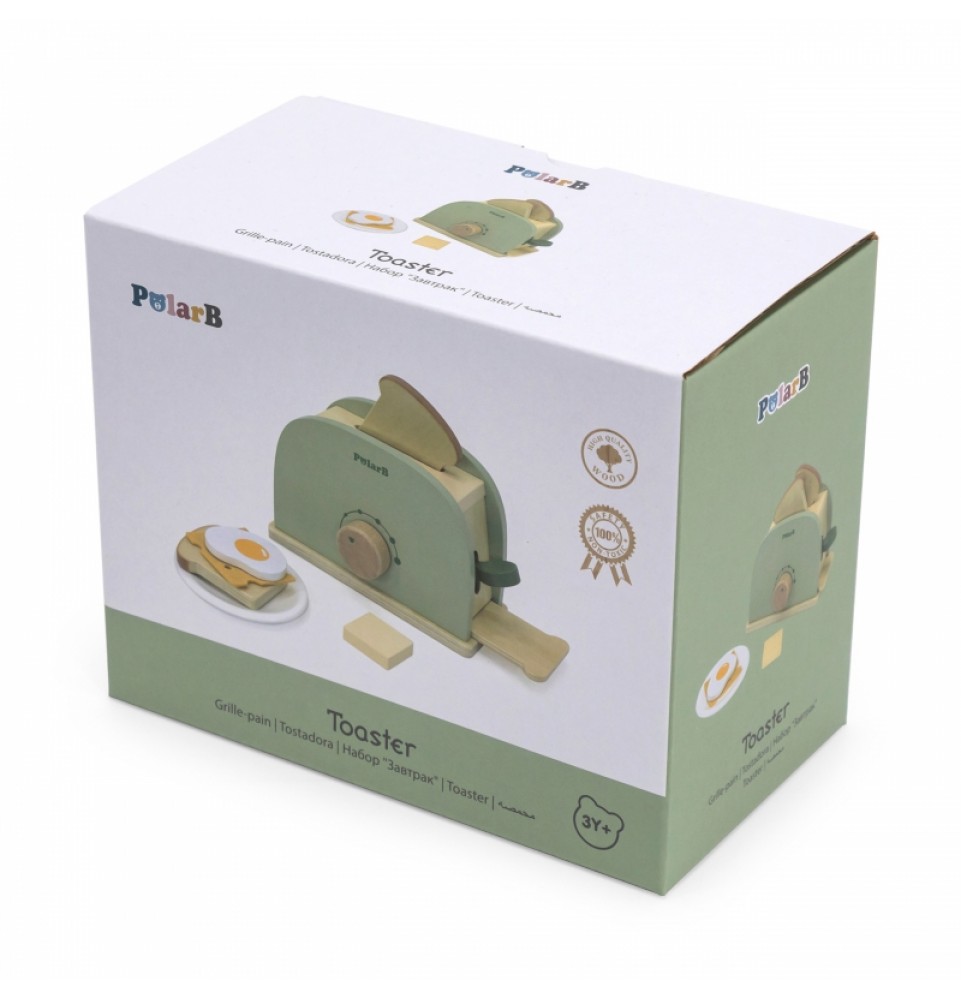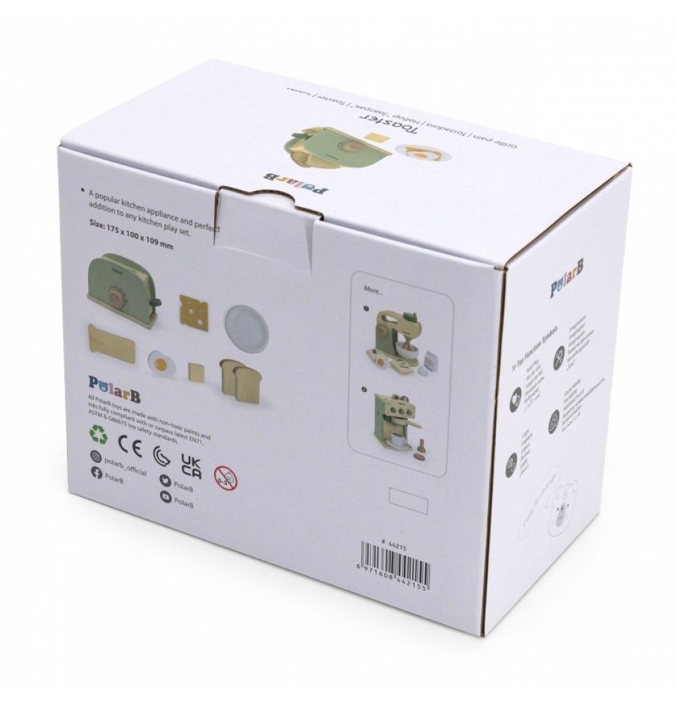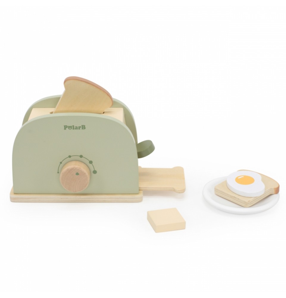 Stilingas, medinis , žalias „PolarB“ serijos skrudintuvas , skirtas išradingai maisto gaminimo pramogai. Jis lavina pažintinius ir rankinius įgūdžius, kūrybiškumą, vaizduotę ir susižavėjimą maisto gaminimo pasauliu. Nuostabus vaiko virtuvės papildymas. Pasukite rankenėlę ir patraukite svirtį. Iškepta skrudinta duona iššoks kaip tikra! Sukant rankenėlę, skleidžiami tikroviški garsai. Šis gražiai pagamintas, saugus žaislas yra gražiai pagamintas, saugus žaislas.