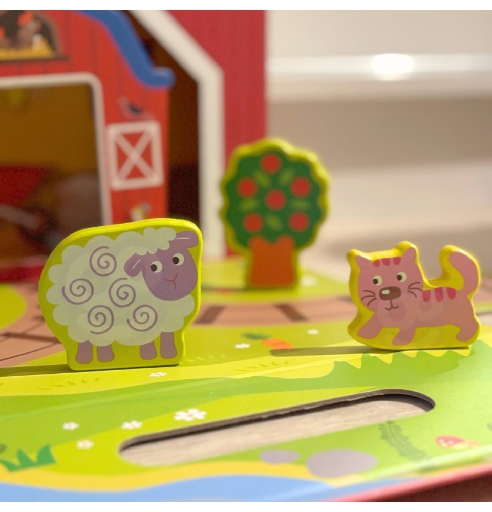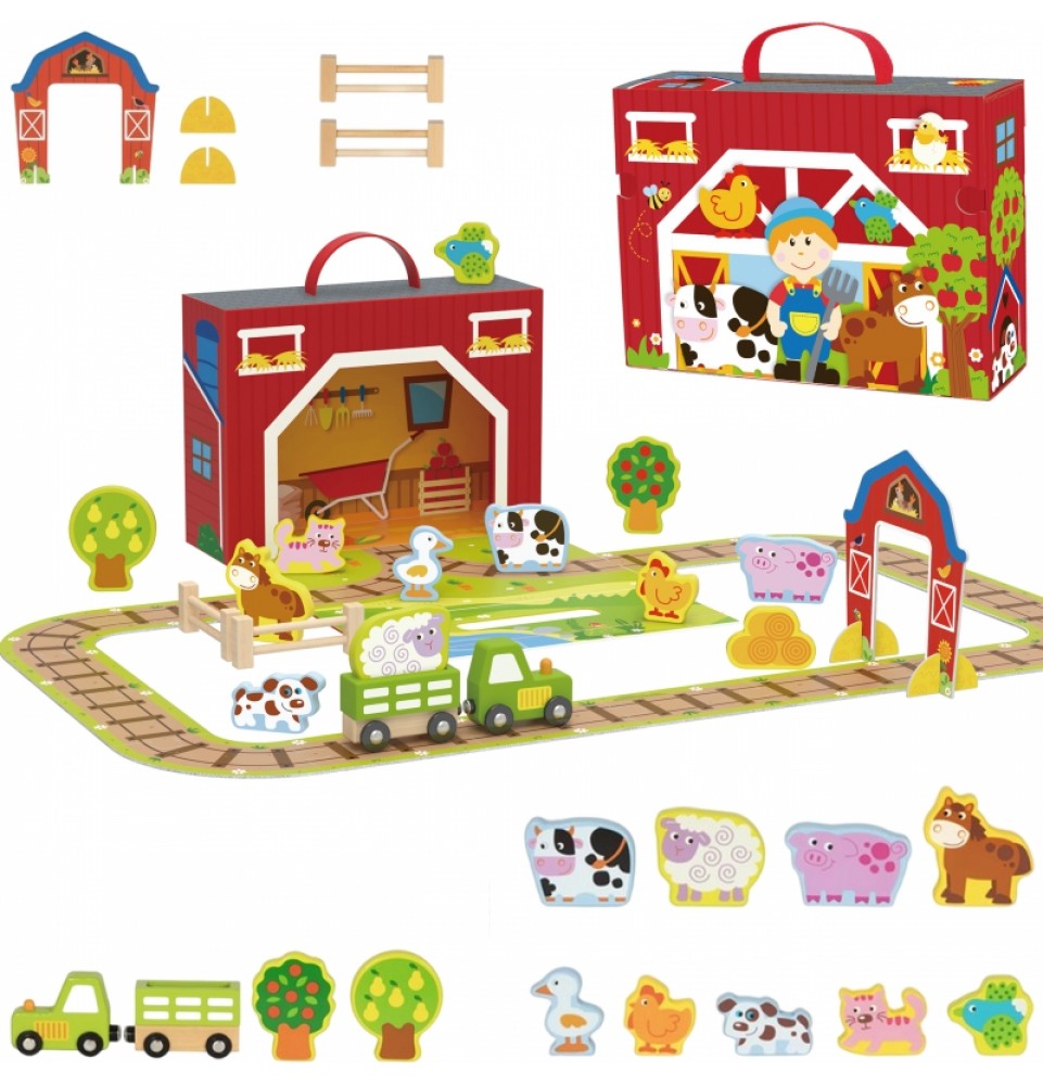 TOOKY TOY medinės fermos lagamine figūrėlės, transporto priemonės