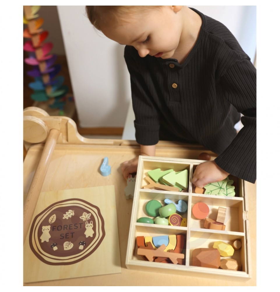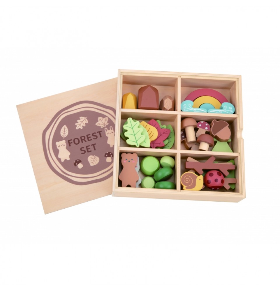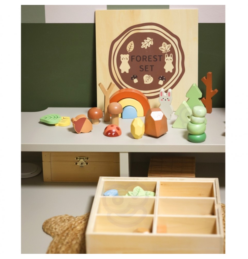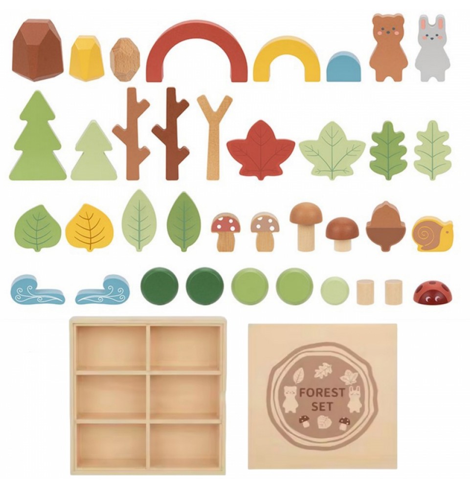 Atraskite stebuklingą mišką savo namų jaukumoje! „Tooky“ žaislinis miško rinkinys yra kruopščiai sukurtas, medinis atviras žaidimų rinkinys, kuriame vaikai gali kurti savo miško stebuklų šalį: medžius, lapus, grybus, gyvūnus, vaivorykštę, bangas ir akmenis. Šiltos spalvos, švelnūs, lytėjimo elementai ir prislopinti tonai skatina kūrybišką žaidimą. Rinkinys supakuotas tvirtoje medinėje dėžutėje su šešiais skyriais ir dangteliu, kurio nugarėlė sukurta kaip kreidinė lenta.