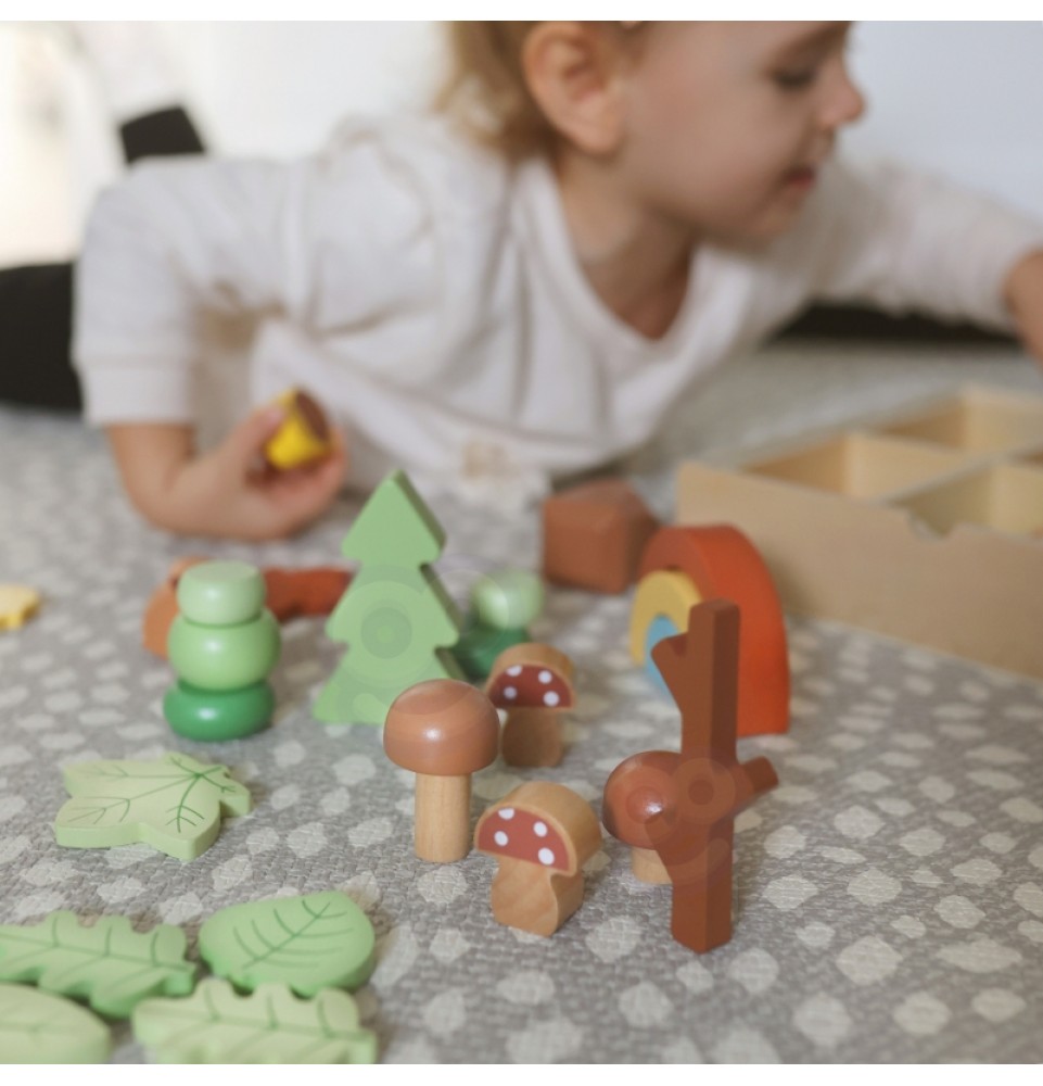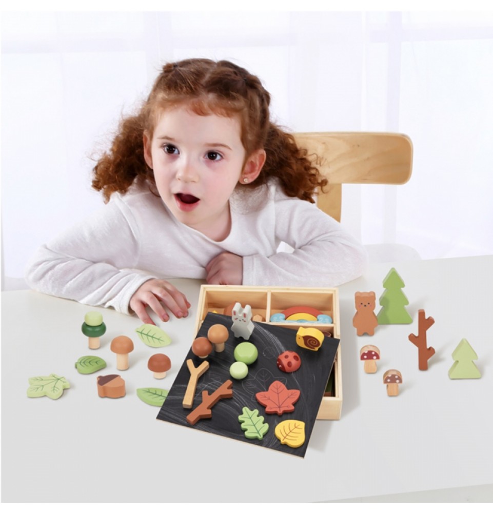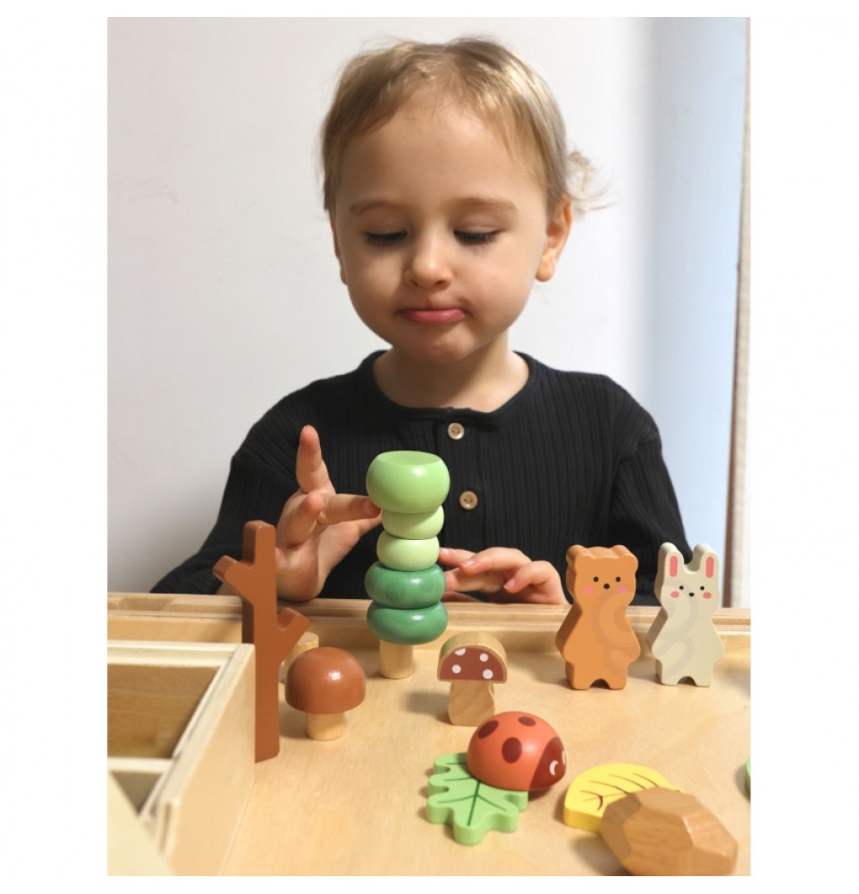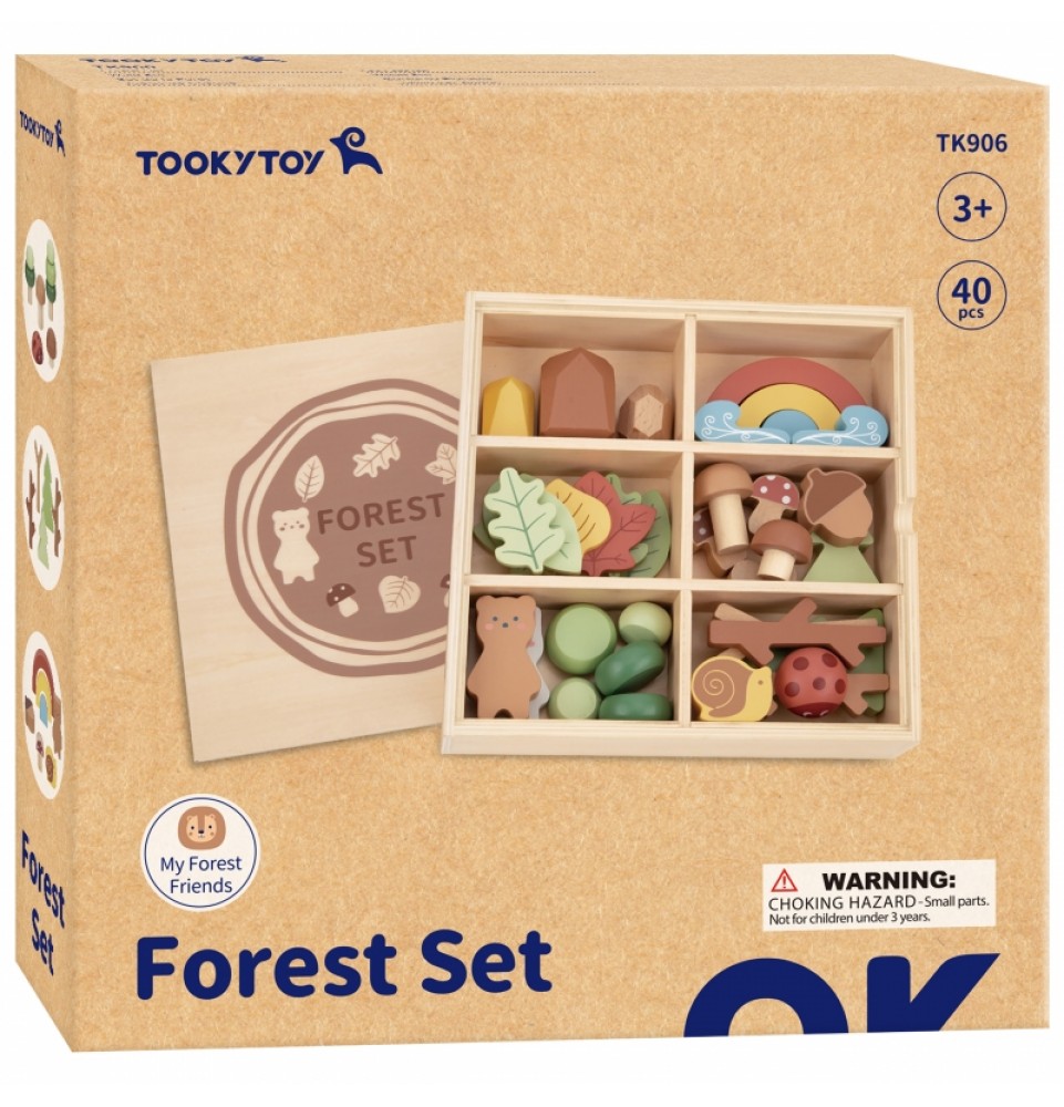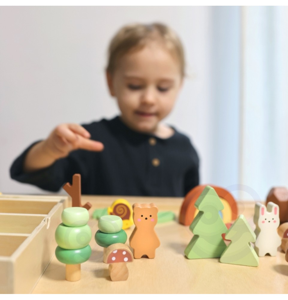 Atraskite stebuklingą mišką savo namų jaukumoje! „Tooky“ žaislinis miško rinkinys yra kruopščiai sukurtas, medinis atviras žaidimų rinkinys, kuriame vaikai gali kurti savo miško stebuklų šalį: medžius, lapus, grybus, gyvūnus, vaivorykštę, bangas ir akmenis. Šiltos spalvos, švelnūs, lytėjimo elementai ir prislopinti tonai skatina kūrybišką žaidimą. Rinkinys supakuotas tvirtoje medinėje dėžutėje su šešiais skyriais ir dangteliu, kurio nugarėlė sukurta kaip kreidinė lenta.
