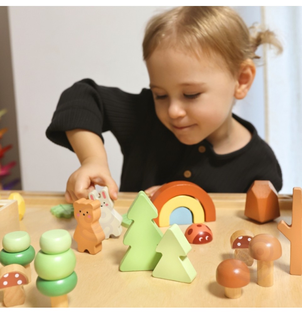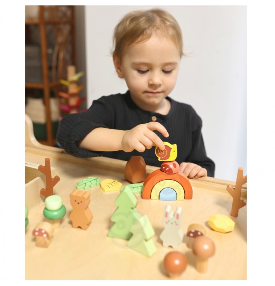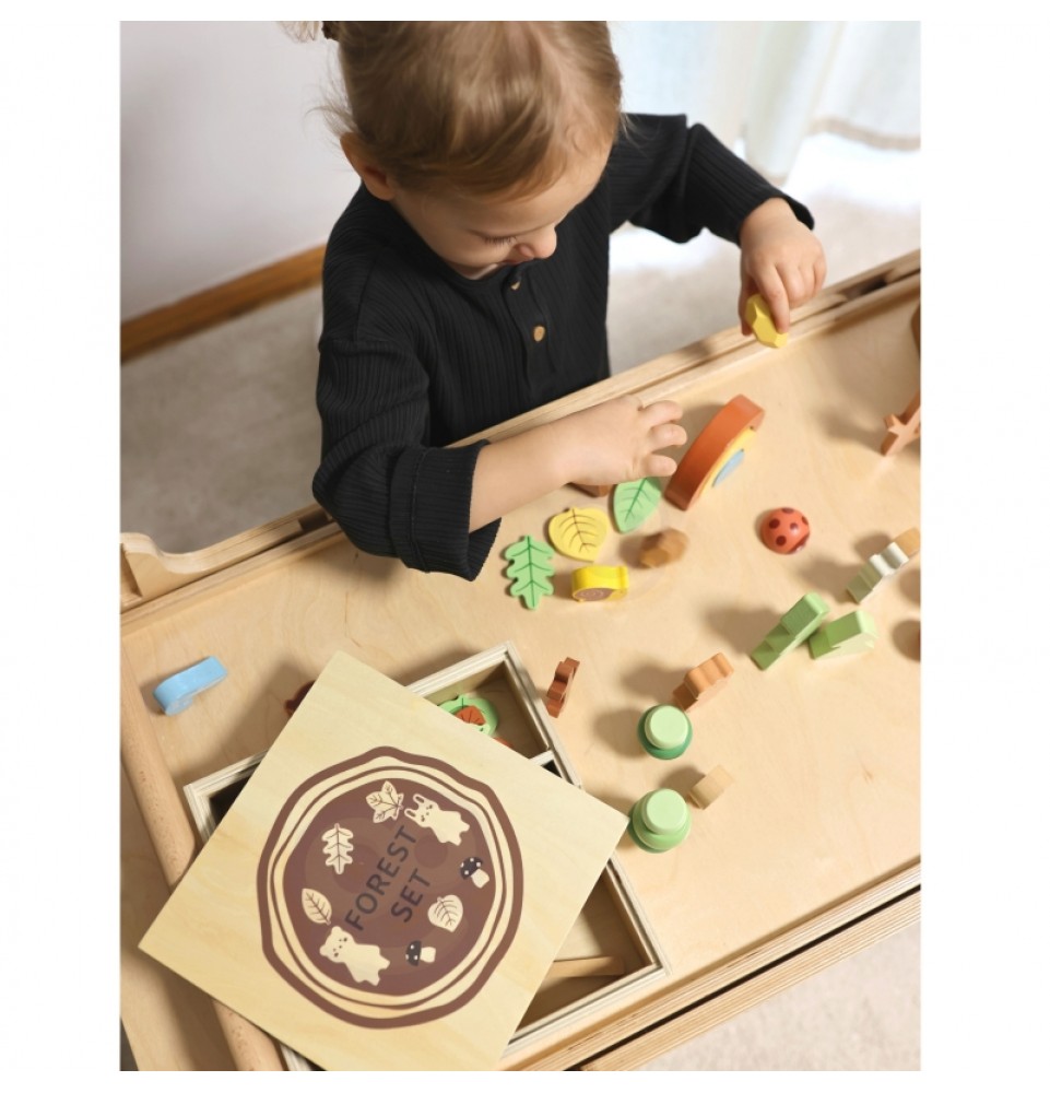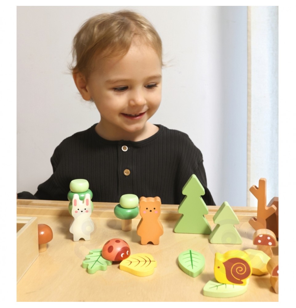 Atraskite stebuklingą mišką savo namų jaukumoje! „Tooky“ žaislinis miško rinkinys yra kruopščiai sukurtas, medinis atviras žaidimų rinkinys, kuriame vaikai gali kurti savo miško stebuklų šalį: medžius, lapus, grybus, gyvūnus, vaivorykštę, bangas ir akmenis. Šiltos spalvos, švelnūs, lytėjimo elementai ir prislopinti tonai skatina kūrybišką žaidimą. Rinkinys supakuotas tvirtoje medinėje dėžutėje su šešiais skyriais ir dangteliu, kurio nugarėlė sukurta kaip kreidinė lenta.